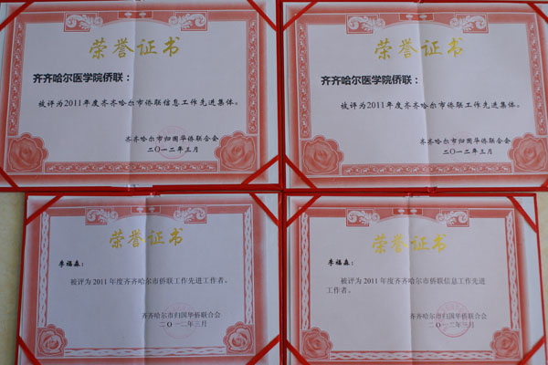 在齐齐哈尔市侨联六届三次全委(扩大)会议上,我院侨联被评为2011年度“侨联工作先进集体”和“侨联信息工作先进集体”;李福森同志被评为2011年度“侨联工作先进工作者”和“侨联信息工作先进工作者”。