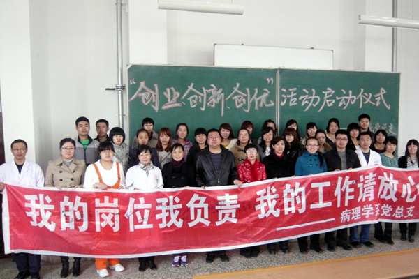 为深入贯彻学院四届一次教代会精神,全面落实“十二五”发展规划,病理学系党总支以“三创”活动为载体,通过开展系列活动,激励全体党员鼓足干劲,开拓创新,以实际行动为学院发展做出更大的贡献。4月17日中午,病理学系组织了“创业、创新、创优”活动启动仪式。党总支书记厉红宣读了《病理学系深入开展创业、创新、创优活动实施方案》,全体党员在印有“我的岗位我负责、我的工作请放心”的条幅上签名承诺。此后,病理学系党总支还将陆续开展每位党员为群众办一件实事、教师教学竞赛、课件比赛等系列活动。