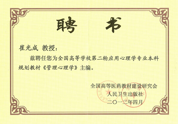 人民卫生出版社有限公司副总编辑兼副总经理杜贤、卫生部教材办主任杨晋、全国高等院校本科应用心理学专业教材第二届评审委员会主任委员、副主任委员、委员、主编、副主编、人民卫生出版社相关编辑等共74人参加了会议。会上,全国高等院校本科应用心理学专业教材第二届评审委员会副主任委员、我院党委副书记崔光成教授作为主编代表发言。
