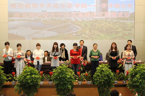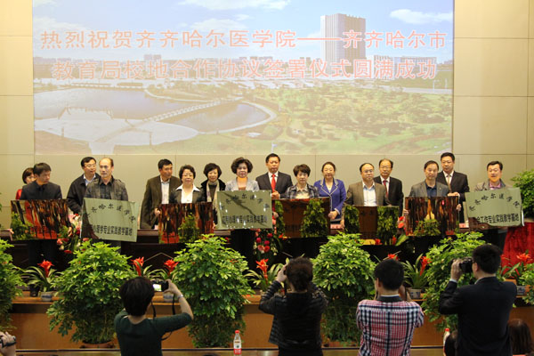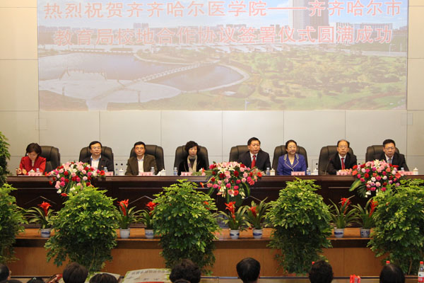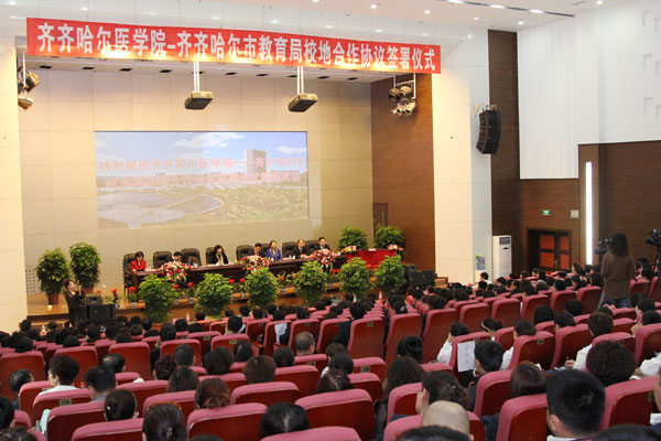 为进一步发挥大学服务社会职能,加强大学与地方教育部门合作,充分发挥双方优势,推动齐市教育事业全面、快速、协调发展,5月18日下午,学院与齐齐哈尔市教育局共同举办的“齐齐哈尔医学院——齐齐哈尔市教育局校地合作协议签署仪式”在我院图书馆多功能厅隆重举行。学院院长刘吉成、市教育局局长金伟代表合作双方在仪式上签署了校地合作协议。市人大常委会副主任曹书杰、副市长曲秀丽、市政协副主席王小平、学院副院长丛明宇、张晓杰出席协议签署仪式,学院党委副书记崔光成主持仪式。齐市北三区教师代表、教育局机关干部及我院各院系书记、院长、附属医院教学副院长共300余人参加了大会。