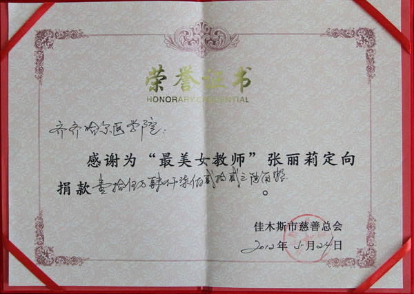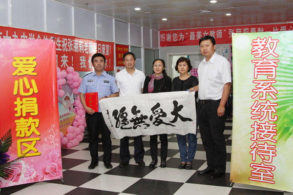 5月24日,学院工会主席谭忠汉代表学院将这笔凝聚着深情厚意的捐款送到了设立在哈医大附属一院的爱心捐助点。希望全院师生的倾情祝福会化作一股战胜死神的力量,为张丽莉老师带去平安和健康。74岁高龄的中国书画艺术研究院黑龙江分院院长董作正先生被我院师生的情谊所感动,欣然为学院题词“大爱无疆”。
