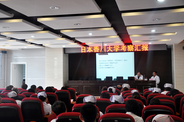 汇报会上,普外科主任张浩民作了赴日研修专题讲座。张主任结合丰富的图片和视频资料,以生动的语言把大家带到了美丽、整洁、设施完备的日本香川大学附属病院,从日本香川的市容市貌,到香川大学附属病院的整洁院容,从医院的管理理念到医疗护理的密切配合,从医务人员的尽职尽责到医院处处体现的人文关怀,使大家对香川大学附属病院先进的技术水平、精良的医疗器械、浓厚的科研氛围、医护人员的敬业、医患关系的和谐以及严谨完善的学习体制留下了深刻的印象,让医护人员深受感动和启发。
