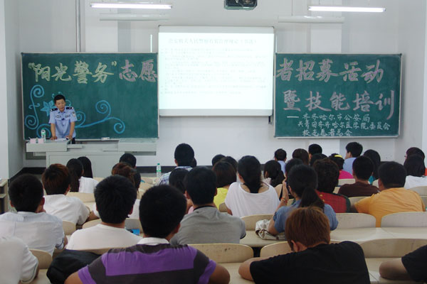 近日,齐齐哈尔市公安局“阳光警务”工作大学生志愿者选拔暨技能培训活动在我院教学主楼北区104教室隆重举行。活动当天,市公安局副局长黄维民为我院志愿者详细讲解了此项活动的重要性和现实意义,并鼓励我院大学生积极参与到“阳光警务”监督工作中来。市公安局杨警官就此项工作的具体事项对我院大学生志愿者进行了深入培训。