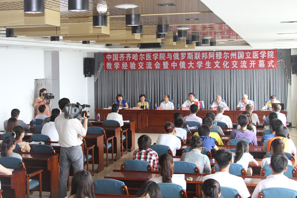 7月10日至12日,俄罗斯联邦阿穆尔州国立医学院医疗副院长阿那托里耶维奇、科研副院长谢苗诺维奇、心脏外科中心院长西朵罗维奇及部分学生代表访问学院,开展教学与文化交流。学院院长刘吉成、党委副书记崔光成、副院长张晓杰等与来宾进行了亲切会晤。院长刘吉成代表学院发表了热情洋溢的讲话,对远道而来的朋友表示热烈欢迎,介绍了齐齐哈尔市和学院的悠久历史与发展现状,他说,中俄两国是友好邻邦,学院与阿穆尔州国立医学院也建立了长久的友谊,希望此次交流能够促进两校在教学、科研及医疗上达成更多合作项目。阿穆尔州国立医学院医疗副院长阿那托里耶维奇对学院的发展建设给予高度评价,期望双方能在更多领域建立友好合作关系,实现共同发展进步。