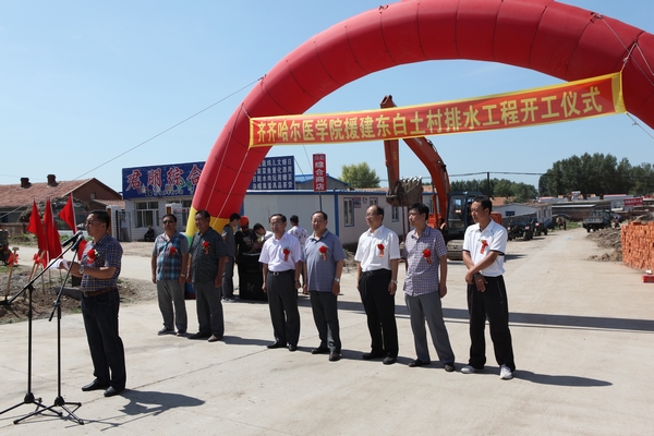 伴随着鞭炮声和掌声,龙江县人民政府副县长尹秀祚宣布龙江县白山乡东白土村排水工程奠基仪式正式开始。学院党委书记邱福利、党委副书记崔光成等领导亲自为工程奠基。