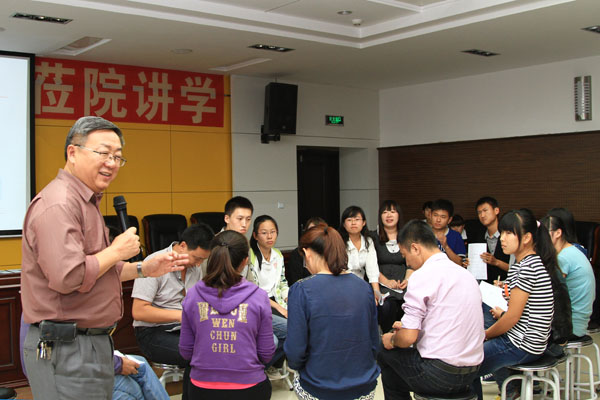 金宏章教授通过在现场师生中开展“生命之重”、“姑娘与水手”、“辅导员的苦与乐”等团体辅导活动,形象生动、深入浅出地为师生们讲解了团体心理辅导的技巧及注意事项。通过此次讲座,进一步提升了我院辅导员队伍的职业化水平和心理辅导能力,为更好地开展学生管理与心理辅导工作起到了积极的促进作用。
