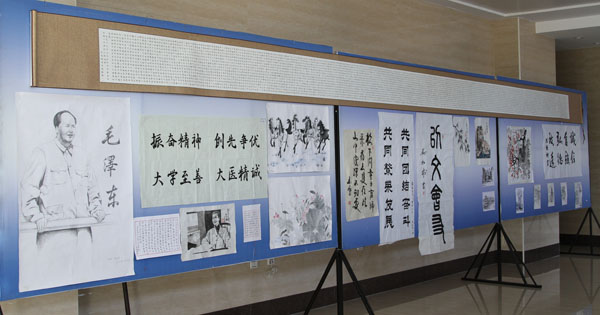 丹青敷彩歌盛世,翰墨流霞颂齐医。为喜迎党的十八大胜利召开,充分展现我院师生员工在学习型党组织建设和创先争优活动中的良好精神风貌,大力推动校园文化繁荣发展,学院工会、党委宣传部、团委联合举办了“丹青书韵”喜迎党的十八大书法、绘画、摄影、征文作品展。经过一个多月认真有序的筹备征集,10月26日,参展作品在图书行政楼一楼大厅正式展出。