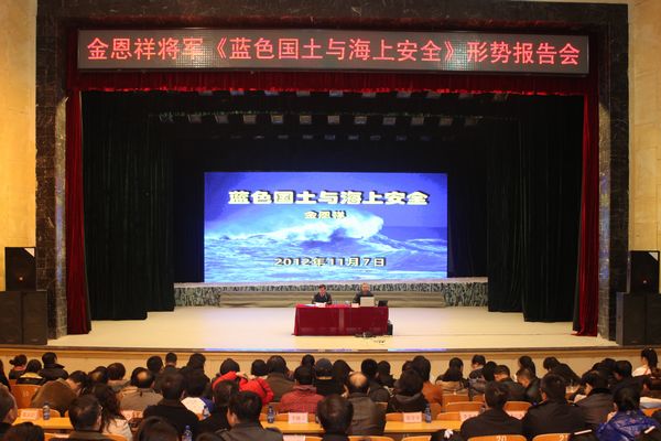 金恩祥少将以《蓝色国土与海上安全》为题,从中国面向的海洋——拓展发展利益和安全屏障的舞台、中国面临的海疆——充满历史争端和现实威胁的挑战、中国面对的海防——需要战略谋划和应急处突的思考三个方面聚焦热点,对中国与邻国的海域争议、中国海洋主权的历史传承、战略意义等问题进行了深入剖析。他指出,海疆承载着历史的沧桑,海防关乎着人民的安康,海权决定着国家的发展,海洋寄托着民族的希望。报告会上,金恩祥少将还呼吁当代大学生要理性爱国、明志强国、知识兴国、青春卫国、岗位报国。报告语言生动、内容精彩,令现场师生意犹未尽,受益匪浅。