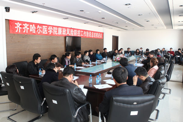 11月8日,学院党委在图书行政楼1804会议室召开了加强廉政风险防控工作阶段总结推进会。学院党委副书记谭忠汉、纪委书记毕红霞出席会议,院本部各基层党委、总支书记、各部门负责人、附属医院党委书记、纪委书记等参加会议。会议由学院纪委副书记、纪检监察处处长李玉雪主持。会上,传达了《李东明同志在教育系统加强廉政风险防控推进会上的讲话》精神,并对下一阶段的廉政风险防控工作作了要求与部署。学院党委副书记谭忠汉在总结中强调,学院廉政风险防控工作已进入风险排查阶段,这一阶段是廉政风险防控工作的攻坚阶段和关键时期,各基层党委、总支要细化任务、落实到人,认真查找本单位、部门的廉政风险点,并提出相应对策。同时,他希望相关部门要继续开展监督检查、综合反馈和理论宣传等工作,集全院之力,做好廉政风险防控各项工作。
