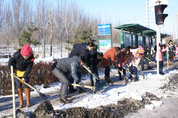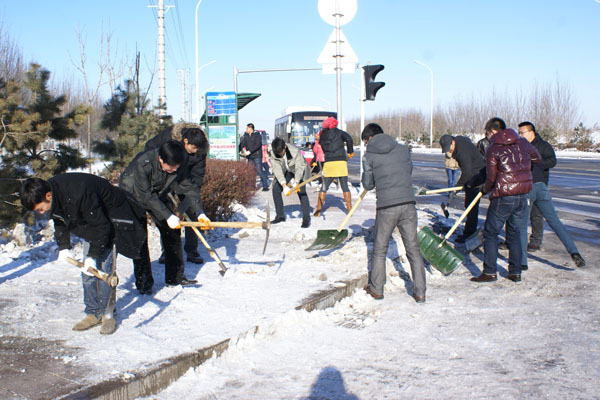 11月23日中午,机关团总支组织了20余名青年职工志愿者,到学院大门前的公交车站点开展了义务清雪志愿服务活动,为师生乘坐公交创造了安全、清洁的环境,为弘扬雷锋精神、展现服务型机关风采付诸了温暖、贴心的实际行动。