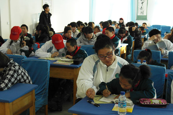 12月5日下午,学院志愿者总会的30余名志愿者照例来到逸夫小学支教,这是他们每周三的例行服务项目。志愿者“教师”除了一对一的对这些农民工和贫困家庭的子女进行数学、语文、英语等课程辅导,还关注着孩子们的心理健康,通过对话、游戏等走进他们的内心世界,倾听他们心灵的呼声。孩子们都很喜欢这些充满爱心的哥哥姐姐,也很感激他们长久以来为自己送去的温暖。当日,团市委和建华区团委的相关领导也来到了支教现场,大家还一同唱起了《相亲相爱一家人》,齐齐哈尔电视台等媒体对本次志愿支教服务进行了采访。