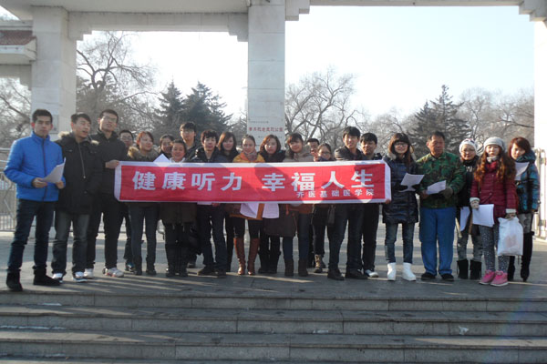 为唤起全社会对老年人听力健康的关注,弘扬无私奉献的雷锋精神,在第14个全国爱耳日到来之际,基础医学院2009级眼耳鼻喉专业志愿者积极响应号召,突出此次爱耳日提出的“健康听力,幸福人生——关注老年人听力健康”这一主题,在龙沙公园、大润发超市门前等人员较多的公共场所,开展了“爱耳日”健康宣传活动。