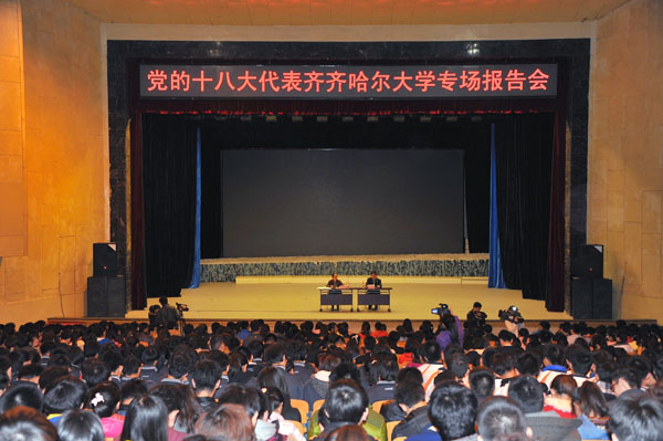 4月3日,学院党委宣传部、团委组织50名学生干部参加了在齐齐哈尔大学举办的党的十八大代表专场报告会。十八大代表、甘南县兴十四村党总支副书记王淑媛为齐市5所高校的1200余名大学生作了题为《以十八大精神为指导 扎根农村 全面展现大学生村官风采》专场报告。