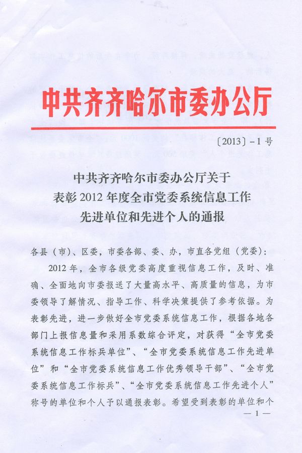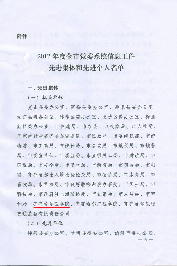 近日,从齐齐哈尔市委办公厅下发的《关于表彰2012年度全市党委系统信息工作先进单位和先进个人的通报》中获悉,我院荣获2012年度全市党委系统信息工作标兵单位称号,党办2名同志荣获2012年度全市党委系统信息工作标兵称号。