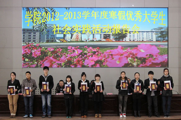 4月17日下午,学院2012—2013学年度寒假优秀大学生社会实践项目表彰暨实践经验报告会在图书行政楼二楼多功能厅隆重举行。党委宣传部部长王彬、教务处副处长云长海、科技处副处长于海涛、学工部副部长李迎新等出席大会,并为受到表彰的学生代表颁奖,大会由团委书记马倩主持,300余名学生代表参加大会。