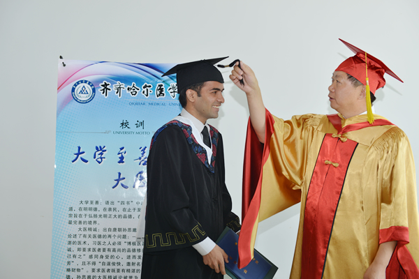 毕业典礼上,张晓杰副院长宣读了学院关于批准13名本科留学生为我院2013届毕业生的决定和关于授予13名本科留学生学士学位的决定。刘吉成院长发表了饱含深情的毕业寄语,代表学院向留学生们表示祝贺,并希望他们毕业后做一名好医生,尽己所能解除本国民众的疾病痛苦;做一个友好使者,为中外友好交流作出贡献;做一个好校友,勿忘母校,勿忘老师,勿忘中国。随后,他为留学生颁发了本科毕业证书和学士学位证书。留学生Ali代表全体留学生在毕业典礼上发言,表达了他们对学院领导和老师的感激之情,并表示毕业后将不辜负学院领导和老师的期许,努力去成就美好人生。