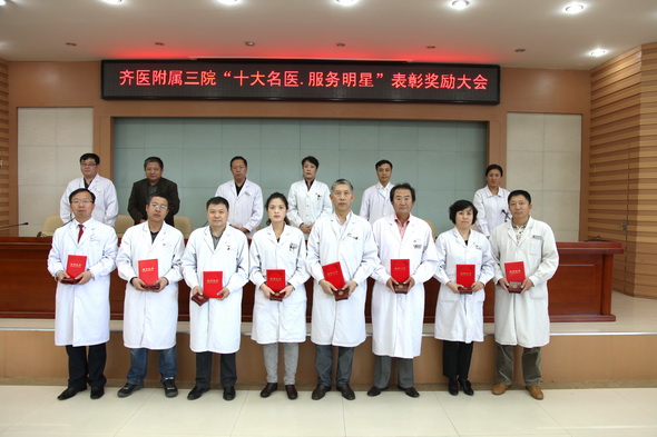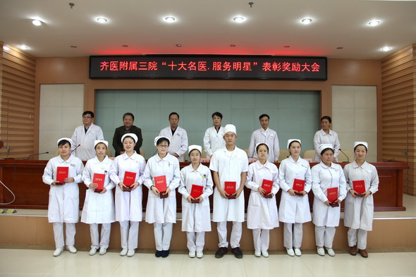 会上,副院长张忠太宣布白玉江、石寒冰、李胜利、陈尔东、邵海峰、张帆、张艳蕉、赵文杰、崔红升、辜振刚获得第二届“十大名医”荣誉称号。院长助理马月华宣读了2012年“服务明星”名单,他们分别是王健晨、李晓红、徐永波、于政恩、邹良君、李红梅、许丽娜、李晓波、张红梅、李淑梅。随后,附属三院领导班子成员为获得“十大名医”、“服务明星”称号的医护人员颁发了奖牌和证书。学院纪委书记、附属三院党委书记、院长毕红霞发表讲话。她对获奖者表示了祝贺,并希望受到表彰的医护人员珍惜荣誉,再接再厉,扎实工作,开拓创新,努力为医院的发展再立新功。