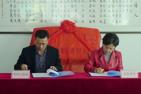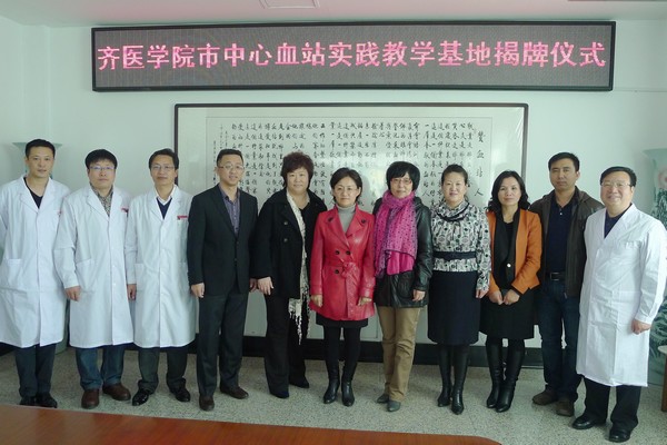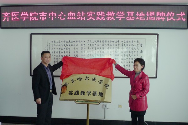 仪式上,张晓杰副院长首先介绍了学院的发展历史、办学特色和优势,对齐齐哈尔市红十字中心血站多年来在我院医学检验专业学生培养中发挥的重要作用及作出的贡献表示衷心感谢,并对血站未来发展致以良好的祝愿。齐齐哈尔市卫生局副局长程丽敏在讲话中希望双方的教学合作对市中心血站工作人员整体素质的提高和血站事业的发展起到积极的推进作用。市红十字中心血站站长林世昌向与会人员介绍了中心血站的发展概况和取得的成绩,并就成为我院实践教学基地后的发展规划进行了详细说明,并表示要向着学院优秀实践教学基地的目标而努力奋斗。随后,张晓杰副院长同林世昌站长签署了《齐齐哈尔医学院实践教学基地协议书》,并为基地揭牌。