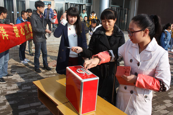 “涓流汇海洋、爱心变希望”。 10月25日中午,精神卫生学院2013级新生在春华城前拉起横幅,承接学哥学姐们的善举,继续开展“一天捐助一角钱,十分关心贫困生”活动,号召广大师生一起为贫困学生捐款献爱心。从他们面前经过的老师和同学都停下了脚步,纷纷捐款,并在印有爱心话语的条幅上写下了自己的名字。活动持续了约1个小时,共筹得捐款596.4元。