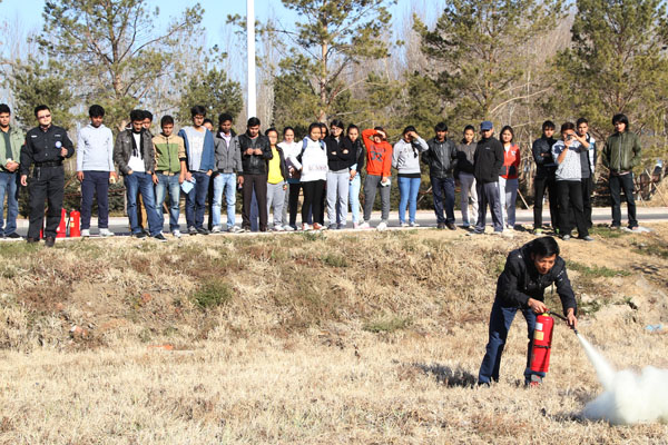 此次演练活动包括三项内容。首先,保卫处工作人员从火灾诱发因素、火灾逃生技巧、消防器材使用等方面,为留学生进行了详细讲解。随后,在模拟火灾环境下,外事处及保卫处工作人员迅速组织留学生撤离,开展了有条不紊的疏散逃生演练。最后,在保卫处工作人员指导下,留学生轮流进行了灭火器实际操作。活动达到了提高我院留学生消防安全意识、掌握基本火灾自救和逃生办法的预期效果,对保护他们的人身安全和构建平安和谐校园具有积极意义。