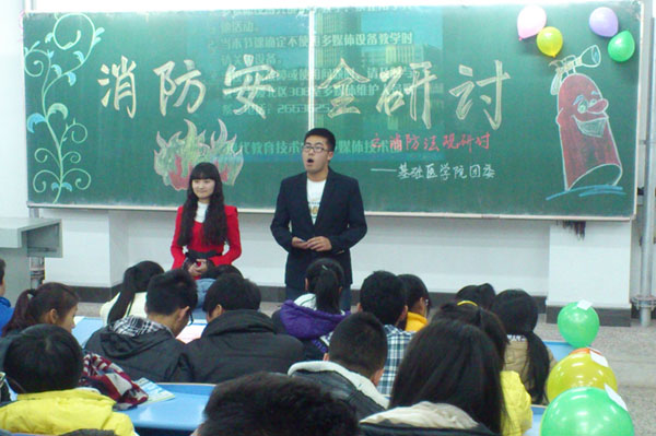 各院系在此次活动中表现踊跃,分别开展了各具特色的宣传教育活动。药学院组织学生开展了消防安全知识征文、图片展及安全知识竞赛;公共卫生学院举办了“强化安全意识,提高自卫能力”专题漫画展;基础医学院召开了消防安全班会、消防安全研讨会;病理学系开展了安全标语征集、安全知识测试活动;护理学院积极开展安全教育进课堂、进寝室活动;精神卫生学院在师生中分别开展了安全知识培训和答题活动;医学技术学院组织师生开展了大型消防演练,外语部、后勤服务公司等也纷纷以专题讲座、播放教育视频、知识测试等形式在师生中普及安全知识。