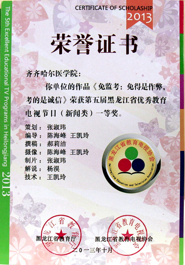 11月29日,黑龙江省教育电视协会2013年年会暨第五届黑龙江省优秀教育电视节目评比颁奖大会在东北农业大学音乐厅隆重召开。我院推荐参评的《免监考:免的是作弊,考的是诚信》荣获电视新闻类一等奖,《教育部专家组对我院临床医学专业认证工作全面展开》、《附属二院“纪念一二•九临床知识技能竞赛圆满落幕”》分获新闻类二、三等奖,《齐齐哈尔医学院卫生所简介及院前急诊急救展示》荣获专题类二等奖,《优秀选手展播——第七届护理技能操作大赛吸氧法》和《精诚甘霖育大医》荣获专题类三等奖。