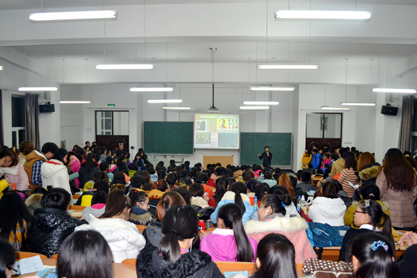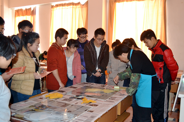 讲座中,侯占春老师从版画的历史及发展历程入手,结合自己多年的版画创作经验,融合理论与实践示范,讲解了版画的材料、创作工具、制作方法以及容易出现的难点。艺术讲座吸引了400余名学生前来学习,现场座无虚席,过道和门外也都水泄不通。随后的几天中,侯占春老师为47名选修“版画”课的学生进行了集中培训,同学们亲自参与了版画从制稿,刻板,上色到印制,装帧的全过程,并最终完成了一幅幅富有生命力的绝版套色木刻作品。为展示学习成果,激发学生学习热情,学院对同学们精心创作的50余幅作品进行了评选和展览,并将予以奖励。