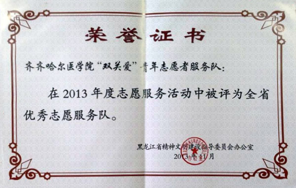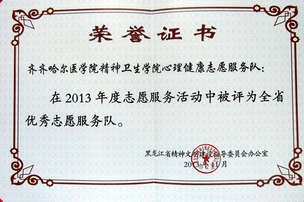 在第28个国际志愿者日来临之际,我省对全省志愿服务活动“五个一百”先进集体和个人进行表彰,我院志愿者总会“双关爱”志愿者服务队和精神卫生学院心理健康志愿服务队荣获全省优秀志愿服务队称号。
