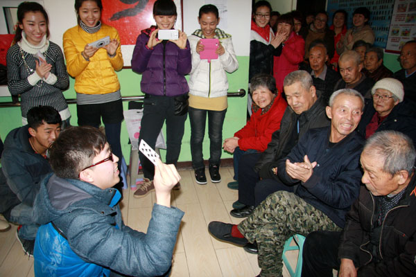 下午2点,志愿者们手提水果来到敬老院,受到了老人们的热烈欢迎。他们为老人们献上了一场精彩的文艺汇演,歌曲、舞蹈、葫芦丝演奏、魔术表演等深得老人们的喜欢,在同学们的感召下,老人们的兴致被充分调动起来,92岁的杨爷爷和83岁的郭奶奶即兴为大家演唱了《歌唱二郎山》和《蓝花花》,看到爷爷奶奶脸上的笑容,同学们也感到无比幸福。汇演结束后,同学们为老人进行了健康指导,并逐一为老人们测量了血压。屋外寒风呼呼,屋内却暖意洋洋,同学们一边陪老人聊天,听他们讲述自己的过去,一边将洗好的水果送到老人手上,屋子里处处洋溢着温馨、流淌着快乐。