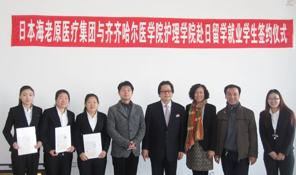 3月10日,护理学院又有3名学生与日本海老原医疗集团签署了赴日留学就业协议。签约仪式上,日本海老原医疗集团与3名将于今年四月赴日学习的学生签订了赴日留学意向书,并就赴日学生今后的语言学习、就业前景、所需费用、工作待遇等问题,与学生及家长进行了详细讨论。护理学院院长杨立群、党总支书记杨泰,日本海老原医疗集团吉井胜行干事长一行,赴日学生及家长代表等参加了仪式。