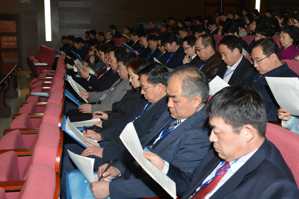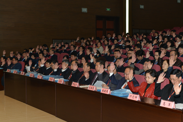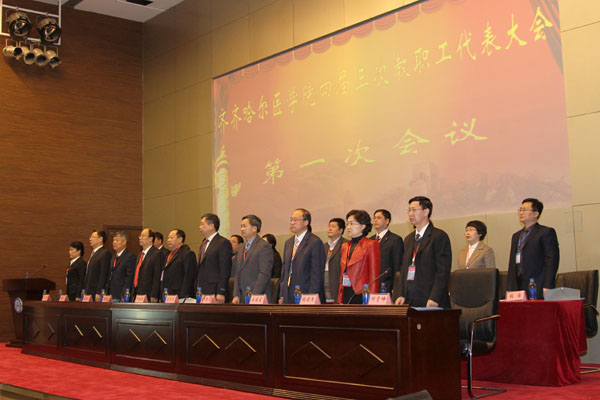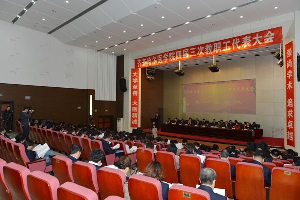 上午9时许,大会在雄壮的国歌声中开幕。全体代表认真听取了院长刘吉成所作的工作报告。报告分为2013年工作回顾和2014年工作任务两大部分。报告指出,2013年,在全院教职员工的共同努力下,学院顺利通过教育部临床医学专业认证,第三次被命名为“省级文明单位标兵”。同时,积极落实《“2011-2015”附属医院发展振兴纲要及2020年远景目标》,正式启动《“2011-2015”科学研究发展振兴纲要及2020年远景目标》,圆满完成了四届二次教代会的主要任务。在人才培养、医疗实力、科研水平、交流合作、管理服务、文明创建等各项工作中均取得了可喜成绩。报告提出2014年的总体工作思路是深入贯彻落实党的十八大、十八届三中全会精神,全面落实国家、省教育规划纲要及学院《“十二五”发展规划》,以加强内涵建设,提高人才培养质量为核心,积极推进制度建设和管理体制改革,促进学院教育教学、医疗卫生、科学研究、综合管理等各项工作全面发展。报告从十大方面对今年工作作出部署:深化管理体制改革,不断提高科学管理水平;落实临床医学专业认证整改工作,提高人才培养质量;提高医疗技术水平,加快“学术型”医院建设步伐;加强学科建设,提高科学研究水平;完善人事管理制度,建设高素质师资队伍;秉承立德树人使命,推进学风建设;扩大国际交流与合作,提高留学生培养质量;加强图书信息建设,提高期刊质量;增强后勤服务意识,做好校园基本建设;加强校园安全工作,提升行政管理水平。最后,刘吉成院长号召全体代表,坚定信心,迎难而上,开拓创新,扎实工作,为实现医科大学“齐医梦”而不懈奋斗。