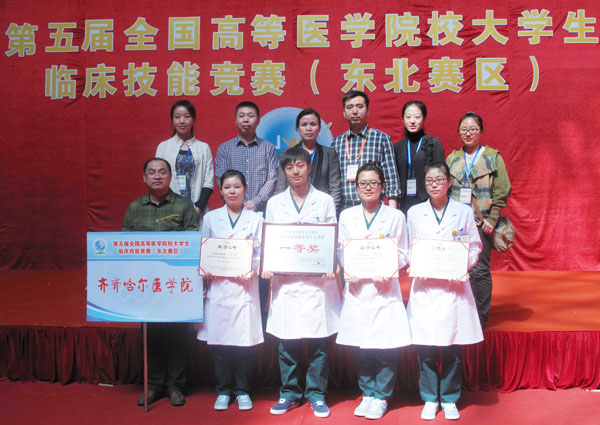 我院此次选派的4名选手丁天航、张乐乐、于倩倩、杨锡龙均来自附属第一医院,是在2013-2014学年大学生临床技能规范化培训活动中,经过层层选拔产生的。学院和附属第一、二、三、六医院、护理学院对参赛学生的培训工作给予了大力支持,4名选手在教务处的统一安排协调下、在培训专家组的悉心指导和临床技能实验教学中心的密切配合下,刻苦学习,认真实践,理论水平和操作能力取得了长足进步。我院选手克服了强手如林的巨大心理压力和张乐乐同学带病上场的实际困难,凭借良好的心理素质、扎实的临床理论和技能基础,充分发扬了团队合作精神,展现了齐医学子的风采。他们还将于5月中旬赴中山大学参加第五届全国高等医学院校大学生临床技能竞赛决赛。这是我院“三导向”人才培养模式改革的一项新成果,是临床医学专业认证整改工作取得新成效的有力证明,为特色应用型本科高校建设工作增添了浓重的一笔。