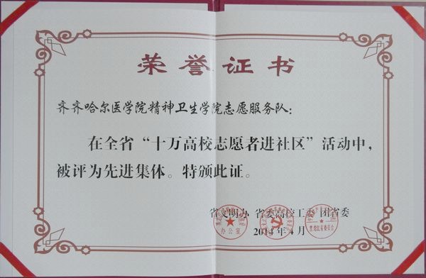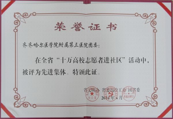 近日,在黑龙江省“十万大学生志愿者进社区”志愿服务活动表彰大会上,我院附属第三医院团委和精神卫生学院志愿服务队荣获全省“十万高校志愿者进社区”活动先进集体荣誉称号,基础医学院杨承烨等20名大学生志愿者被评为“十万高校志愿者进社区”活动优秀志愿者。