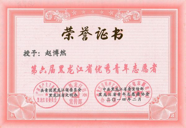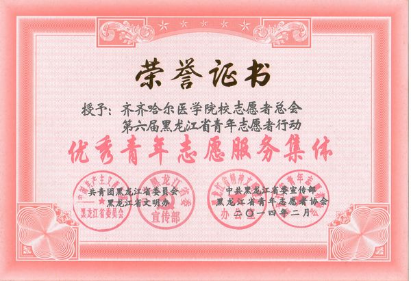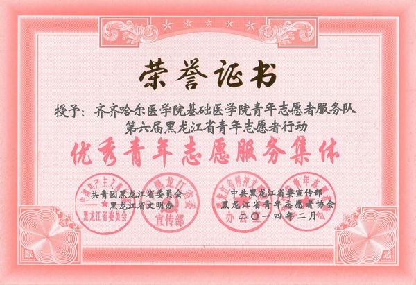 此外,在今年2月举办的黑龙江省第六届青年志愿者表彰活动中,我院校志愿者总会及基础医学院青年志愿者服务队荣获“优秀青年志愿服务集体”荣誉称号,我院志愿者总会主席赵博然同学被评为“第六届黑龙江省优秀青年志愿者”。