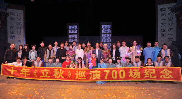 话剧《立秋》讲述了曾经富甲天下数百年的晋商丰德票号,在民国初年,因时局动荡、国运衰微而面临生死存亡考验,最终由盛而衰的故事。祖宗与后代、传统与现代的历史对话,保守与革新、禁锢与自由、情感与情理的激烈冲突,将剧情一次次推向高潮,让观众在不断的反思与批判中,体味着晋商“勤奋、敬业、谨慎、诚信”的思想精髓,感受着“天地生人,有一人应有一人之业;人生在世,生一日当尽一日之勤”的进取精神。现场观众无不被《立秋》引人入胜的故事情节和演员们出色的表演所感动。他们在接受现场采访时表示,话剧《立秋》是一部集思想性、艺术性与观赏性于一体的优秀舞台剧,同学们在接受艺术熏染的同时,也受到了一次精神洗礼,他们深刻体会到了爱国、敬业、诚信、友善的巨大力量,他们决心勤奋学习、诚信为人、谨慎做事,为实现中华民族伟大复兴的中国梦贡献自己的力量。