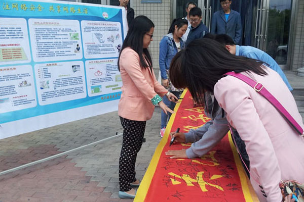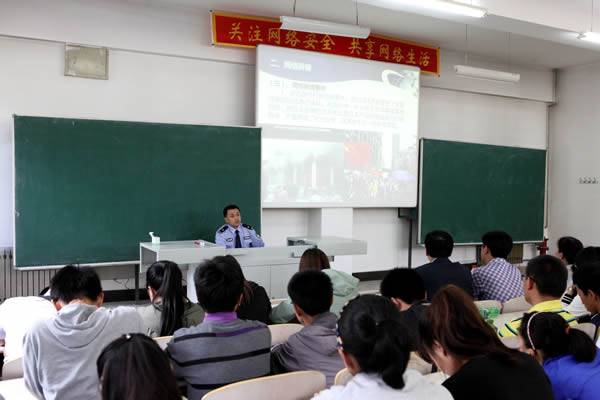 网络安全周活动启动后,现代教育技术中心设计制作了“齐齐哈尔医学院网络安全周”专题网站,并在校园网首页进行展示,大力宣传网络安全知识。随后,于5月26日举办了学生网络安全知识竞赛,100余名学生参赛,在计算机实验室进行了网络答题竞赛。5月28日下午,现代教育技术中心联合精神卫生学院,邀请市网安支队严廷良警官为师生作了《互联网与安全》专题讲座。严廷良警官从网络发展概念与相关法律规定、网络舆情事例、网络信息安全及网络诈骗、如何预防网络诈骗等四个方面进行了细致讲解。市网安支队、精神卫生学院、现代教育技术中心、保卫处负责人等出席了讲座活动。5月29日中午,现代教育技术中心在春华城前举办了网络安全知识宣传及师生签名活动,通过彩色宣传挂图等形式向广大师生宣传网络安全知识。