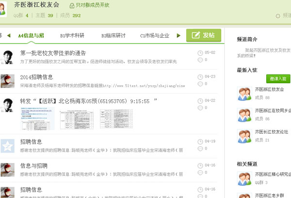 目前,在齐医浙江校友分会和学院校友总会相关人员的帮助下,在校齐医浙江老乡会同学已集体加入齐医浙江校友会大家庭,浙江校友会也在QQ交流群论坛中设立了学生实习就业招聘栏目,同时,将已建立的三个交流平台与齐医浙江籍在校生同乡会的QQ群通过QQ群广场相互连接,实现信息共享。短短一个月的时间,浙江校友分会就在群里为在校学生提供了几十条实习及就业招聘信息。