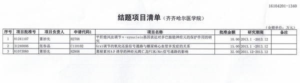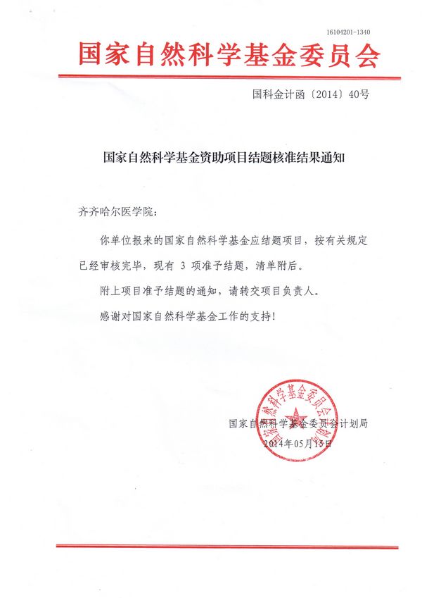近日,国家自然科学基金委员会计划局下发了《国家自然科学基金资助项目结题核准结果通知》,我院董妙先副主任医师主持的国家自然科学基金面上项目《葛根素对Aβ诱导的神经元凋亡及PI3K/Akt信号通路的影响》、专项基金项目《平肝熄风法调节α-synuclein基因表达对多巴胺能神经元的保护作用的研究》和张春晶副教授主持的国家自然科学基金专项基金项目《Grx1调节的氧化还原信号通路与糖尿病心血管并发症的关系》共3项国家自然科学基金项目通过验收,顺利结题。
