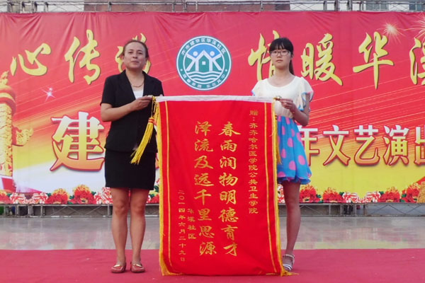 公共卫生学院自去年与建华区西大桥街道华溪社区签订区域化党建共建协议后,组织学生定期深入华溪社区开展公益劳动和志愿服务活动。华溪社区对公共卫生学院志愿者长期无私的奉献给予高度赞扬,向公共卫生学院赠送了“春雨润物明德育才 泽流及远千里思源”锦旗,激励青年学生在志愿服务中为全面建成小康社会贡献力量,并希望进一步加强与公共卫生学院的和谐共建。在随后的文艺演出中,公共卫生学院学生组成的健美操表演队用力与美展现了青年人努力实现“中国梦•齐医梦•我的梦”的激情与活力;优秀学生代表王兆娴与侯宇演唱的歌曲《千山万水》激情澎湃,引起了现场观众的强烈共鸣。同时,学生们还参了与社区集体舞《再唱山歌给党听》等节目,向伟大的党献上诚挚的祝福,共同祝愿我们的党、我们的祖国明天更美好。