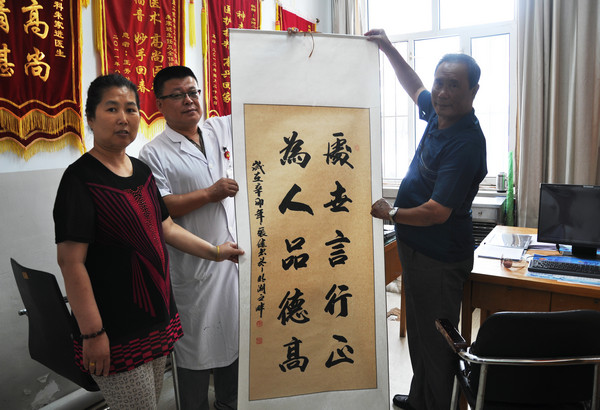 8月4日上午,患者曹女士及老伴怀着激动的心情,将写有“处世言行正,为人品德高”的书法作品送到附属二院精神卫生中心开放病区,专程感谢该病区的朱家进主任成功治愈了曹女士30年的顽疾。