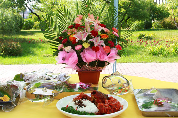 今年的美食节现场布置得简洁低调,虽然没有彩旗、彩虹门和汽球的装饰,但展出的美食依然吸引了众多师生前来品尝。食品展区刚布置好,便有大批学生争相购买,美食节现场顿时变成了美食城,师生们熙熙攘攘,络绎不绝,学院副院长姜凤楼和王晓星也来到美食节现场,与广大师生一起欢度美食节。今年美食节展出的美食特点是少而精,以师生喜爱的食品为主,包括熏兔、松鼠鱼、臭豆腐、炸鱿鱼、关东煮、酱猪手、粽叶鸡等副食,还有八宝鱼饭、蛋挞、各种蛋糕和面包等五彩缤纷的主食。活动结束时,各个摊位的美食几乎都销售一空。