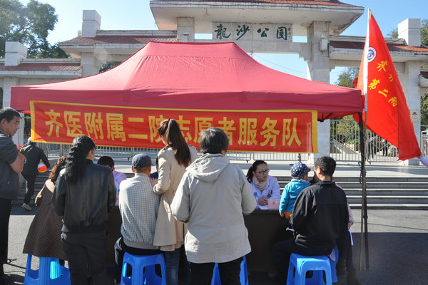 9月30日下午,在建国65周年来临之际,附属二院团委组织职工及学生志愿者到龙沙公园门前,为市民义诊。活动中,儿科主治医师李冬梅、神经内科医师梁春明、心血管内科隋慧颖医师带领学生志愿者们耐心热情地为市民宣讲医学小常识、量血压、问病史,并为市民们提供相关的诊疗方案,活动得到了市民们的热烈欢迎和高度赞扬。