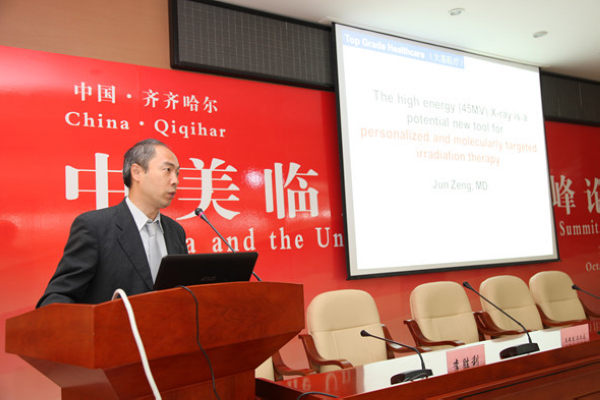 10月15日下午,中美临床肿瘤高峰论坛在附属三院门诊综合楼四楼报告厅举行。美国FoxChase肿瘤中心放射物理学主任马长明博士,放射肿瘤学副主席Dr. Mark L. Sobczak教授,肿瘤外科副教授、外科肿瘤学主任、皮肤肿瘤学联合会主席Dr. Jeffrey Farma教授,胃肠道肿瘤风险评估项目主任、临床遗传学系主任Dr. Michael J Hall教授,北京大基医疗副总裁、无锡亿仁医院执行院长曾骏,北京大基医疗副总裁、医疗设备研究院院长张圈世,附属三院党委书记苏江、副院长孙兴元、肿瘤分院院长李胜利出席会议。来自齐齐哈尔市及大庆市医疗机构的专家、附属三院职工、实习学生400余人参加会议。会议由肿瘤分院副院长佟旭主持。