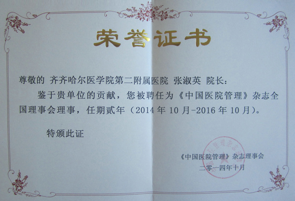 《中国医院管理》是国内卫生管理领域创刊最早、学术影响较大、发行量市场覆盖率最高的专业学术期刊,旨在报道我国医院管理学术研究和实践探索的最新进展,推动我国医院管理科学的学科发展和医院管理水平的提高。张淑英教授作为《中国医院管理》杂志全国理事会理事,将更好地带动附属二院乃至齐市医院管理的发展和进步。