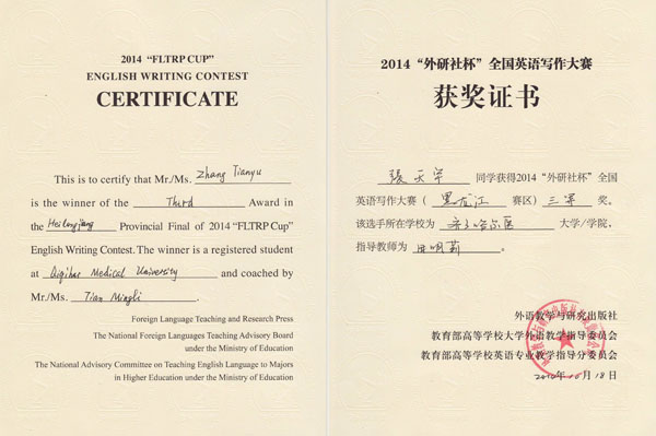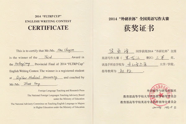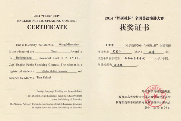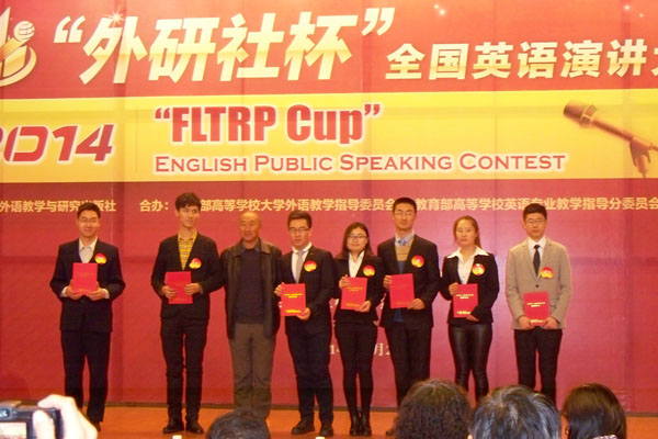 10月26日,2014“外研社杯”全国英语演讲大赛黑龙江赛区决赛在黑龙江科技大学举行。全省30余所高校的近60名选手参加决赛。经过激烈角逐,学院基础医学院王苗苗同学荣获二等奖,田志伟老师获得指导教师二等奖。此外,我院选送的侯丞泽和张天宇两位同学在黑河学院举行的第二届“外研社杯”全国英语写作大赛黑龙江赛区复赛中获得三等奖,赵松老师和田明莉老师获得指导教师三等奖。(外语部2014年10月28日供稿)学院获奖学生王苗苗(右三)上台领奖