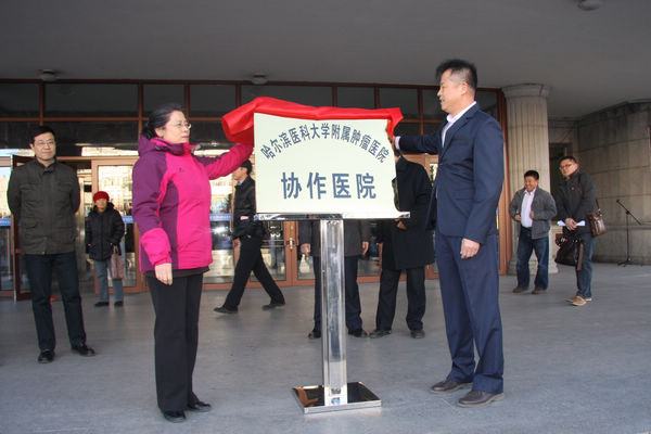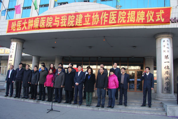 学院党委副书记崔光成、齐齐哈尔市卫生局局长付厚林、富拉尔基区政府副区长黄鹤、区卫生局局长王富,龙江县卫生局副局长赵友及附属一院部分医务人员参加了揭牌仪式,仪式由医院党委书记胡凯主持。张嘉伟院长在揭牌仪式上代表医院全体员工对哈医大专家的到来和他们的无私奉献表示了衷心感谢,并希望借此平台全面提升医院医疗服务质量。揭牌仪式后,张嘉伟院长还与哈医大附属肿瘤医院刁春香院长签署了医院协作文件。