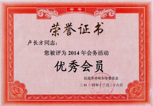 12月26日下午,民进齐齐哈尔市委2014年总结表彰大会在市党政机关办公中心召开。会上表彰了民进市委先进集体和优秀会员,民进齐齐哈尔医学院支部在2014年会务活动中被评为先进集体,卢长方被评为优秀会员,并作为代表上台领奖。