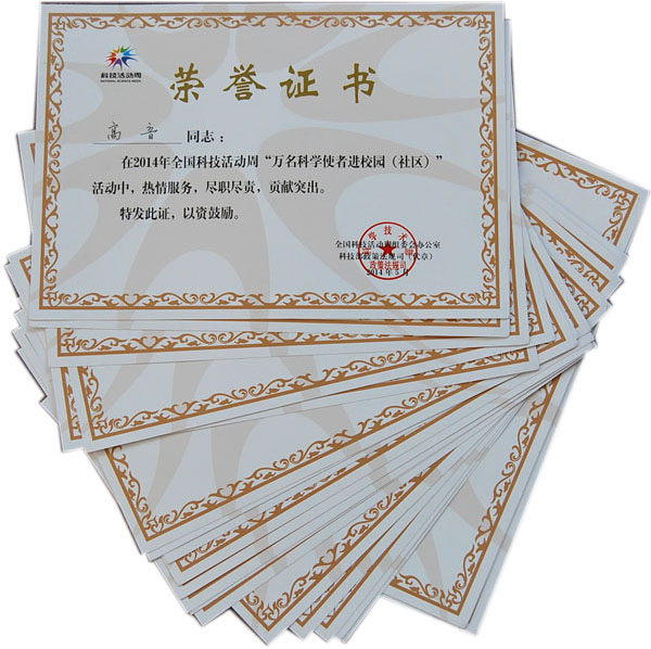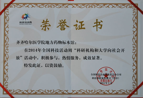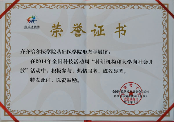 近日,学院基础医学院形态学展馆、地方药物标本馆荣获科技部政策法规司颁发的2014年全国科技活动周“科研机构和大学向社会开放”活动荣誉证书;基础医学院形态学展馆负责人高音等30名科普志愿者荣获2014年全国科技活动周“万名科学使者进校园(社区)”活动荣誉证书。