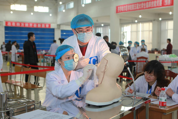竞赛包括多站式比赛、赛道式比赛和理论测试三部分,并应用了标准化病人,综合考察学生内、外、妇、儿、急诊急救、耳鼻喉等操作技能、相关理论知识及人文关怀和无菌观念等。多站式比赛共设14站,每站设有技能操作项目及理论试题,每站完成时间为6分钟,准备时间为2分钟,各参赛队同时操作,每队单循环完成所有参赛项目。在赛道式比赛中,每个赛道含6个赛站,参赛选手分轮进入赛道并在40分钟内完成全部操作。由各临床教学基地具有副高级以上职称、拥有丰富临床技能考核经验的专家组成的裁判队伍,根据选手表现进行现场评分,确保了比赛的客观、公平与公正。