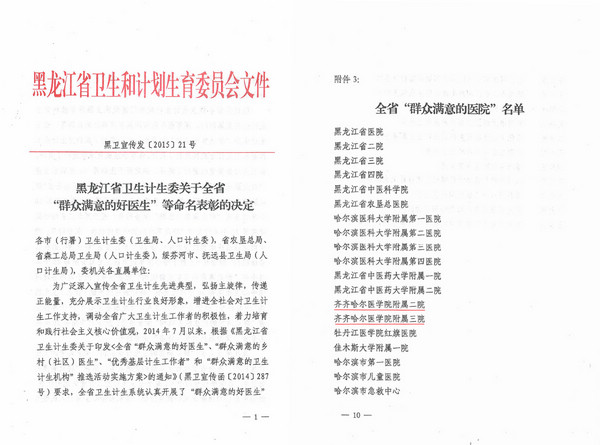日前,从黑龙江省卫生和计划生育委员会获悉,附属二院、附属三院被评为全省“群众满意的医院”。